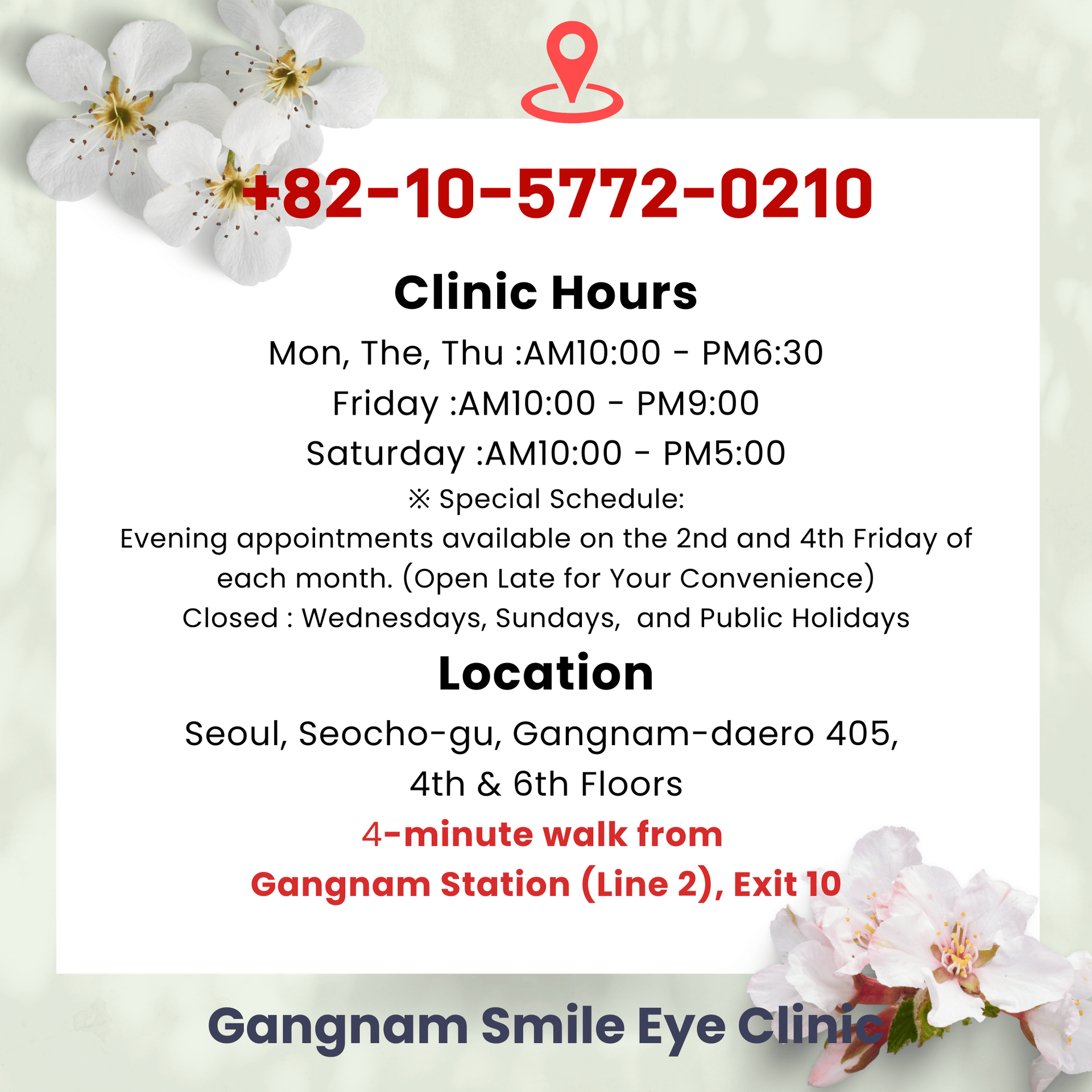Experience advanced laser vision correction at Gangnam Smile Eye Clinic, just 1 minutes from Gangnam Station Exit 10.